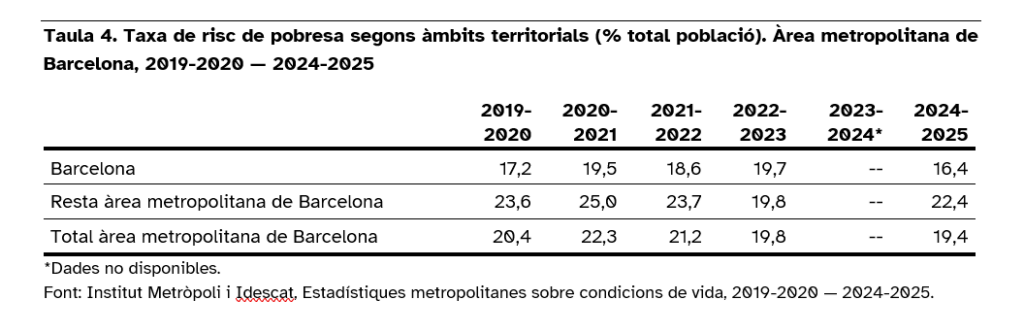- Repunt a la corona metropolitana: A diferència de Barcelona ciutat, on el risc de pobresa ha baixat al 16,4%, als municipis de la resta de l’àrea metropolitana aquesta taxa ha pujat fins al 22,4%.