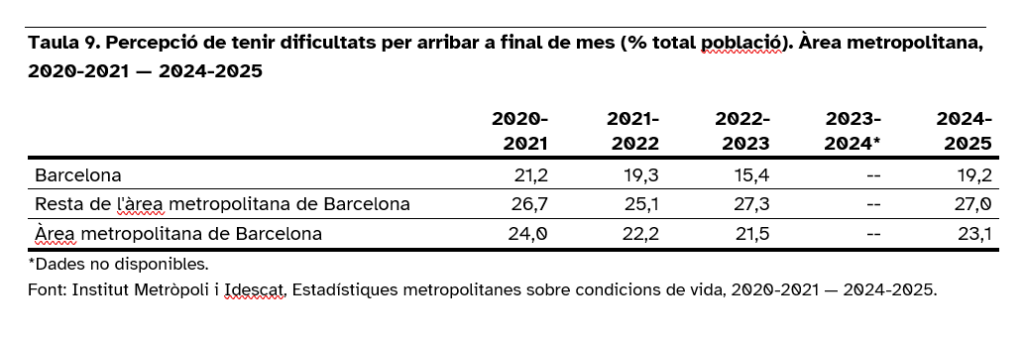 - Major dificultat econòmica: El sentiment de no arribar a final de mes és molt més agut fora de la capital, afectant el 27,0% dels veïns de la corona metropolitana, en comparació amb el 19,2% dels barcelonins.