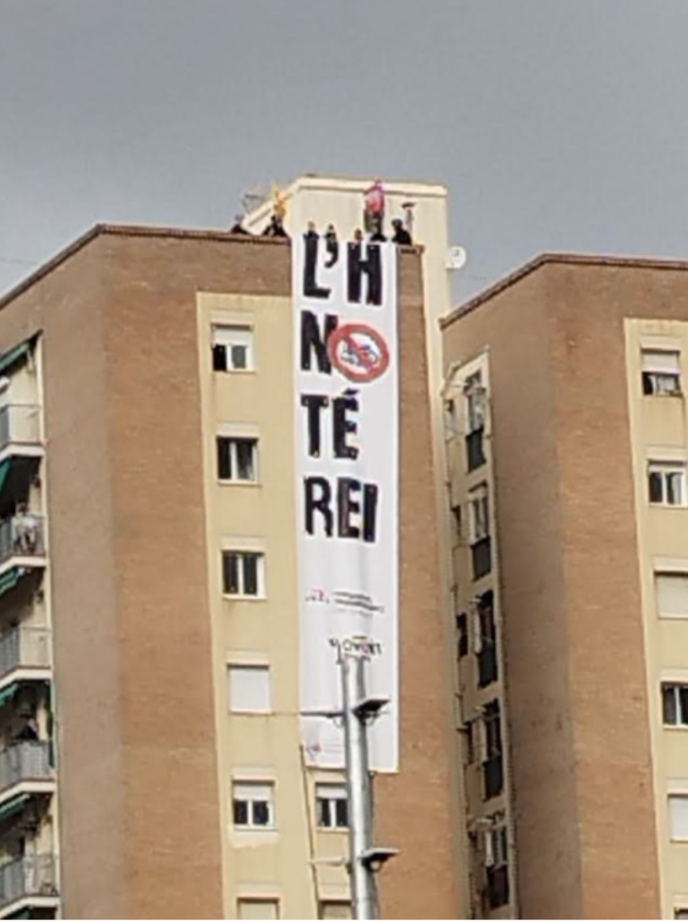 Amb diverses pancartes i senyeres, entre les quals es podia llegir A l’Hospitalet no tenim rei. Els Borbons no són benvinguts —i una d’especialment vistosa penjada des d’un terrat dels blocs on es podia llegir en vertical L’H NO TÉ REI—, la gent es va anar agrupant el més a prop que els van deixar del mercat de La Florida, on està el Centre de Transformació Digital La Florida 6.0 que l’alcalde volia ensenyar al rei. Per cert que l’amplíssim dispositiu policial que a tot hora va rodejar la visita del monarca —sembla que només de Madrid el van acompanyar vuit membres de l’escolta real—, va provocar diversos enfrontaments amb els organitzadors, que van quedat retinguts en diversos moments. Això va estar especialment greu en el cas de la regidora Sílvia Casola (ERC) que es va veure expulsada de la concentració per la força, en allò que els organitzadors han considerat un greu atemptat contra la llibertat d’expressió i de manifestació pacífica. Un acte igualment significatiu per la seva gravetat, el que van sofrir els membres del Jovent Republicà de l’Hospitalet que van estar identificats, retinguts una estona i víctimes de material requisat, durant el desplegament de la pancarta vertical des del terrat d’un dels edificis propers.