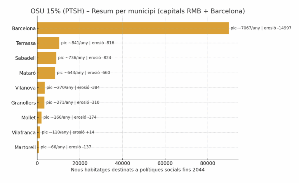 Tant el Pla 50.000 i la reserva pública de solars són moviments polítics més que no pas de planificació a llarg termini, i això està bé. Tota estratègia estructural necessita accions palanca que demostrin viabilitat i mantinguin el pols mentre despleguem el rumb que marca el PTSH: arribar el 2044 al 15% d’objectiu de solidaritat urbana (OSU) i al 10,3% d’habitatge de lloguer social sobre el parc principal. Ara bé, desagregar el mandat de l’OSU a escala regional n’aclareix la geografia i, sobretot, la governança: dels 196.349 habitatges socials assignats a l’RMB fins al 2044, Barcelona en concentra 89.859 (~46%), la resta de l’AMB 68.215 (~35%) i les vuit capitals comarcals (Granollers, Mataró, Martorell, Mollet, Sabadell, Terrassa, Vilanova i Vilafranca) 38.275 (~20%).