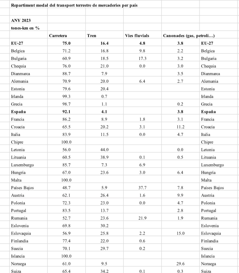 3r Ampliar l’oferta ferroviària de mercaderies per fer viable el traspàs d’una part significativa d’aquests vehicles pesants. Tinguem en compte que una proporció important d’ells travessen tot Catalunya sense que aquest sigui el seu destí final. Catalunya amb Espanya es troben a la cua del transport ferroviari de mercaderies, com podem veure en aquest quadre: